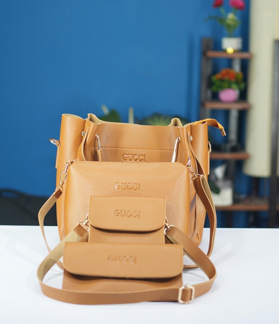 ৪টি ভিন্ন সাইজের ব্যাগ: একটি বড় টোট ব্যাগ, একটি মিডিয়াম সাইজের ব্যাগ, একটি স্টাইলিশ পার্স এবং একটি ছোট মোবাইল ব্যাগ। আপনার সব প্রয়োজন মেটাতে একটি পারফেক্ট কম্বো!